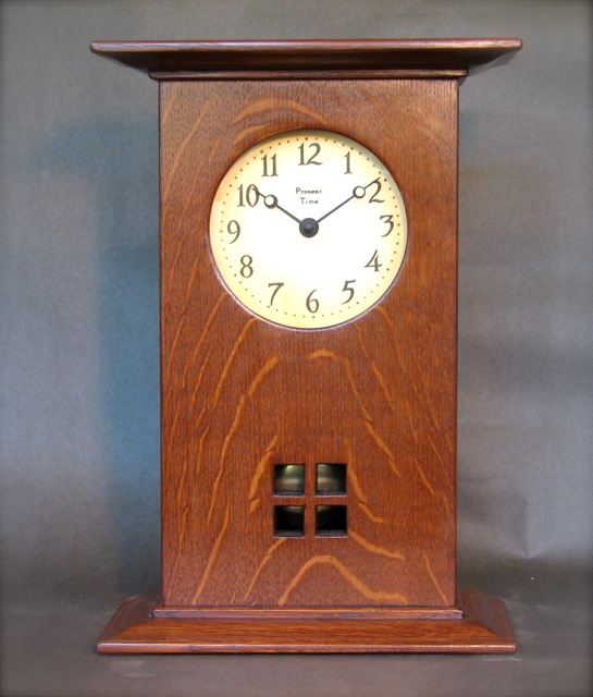 Related to the simple Craftsman design of the Prairie, the Column also features a four square mortised detail that reveals the pendulum. The Column is 15″ tall, 5 1/2″ deep with a 5″ face. Oakland, Roman, Eccentric and Alpine faces are available.