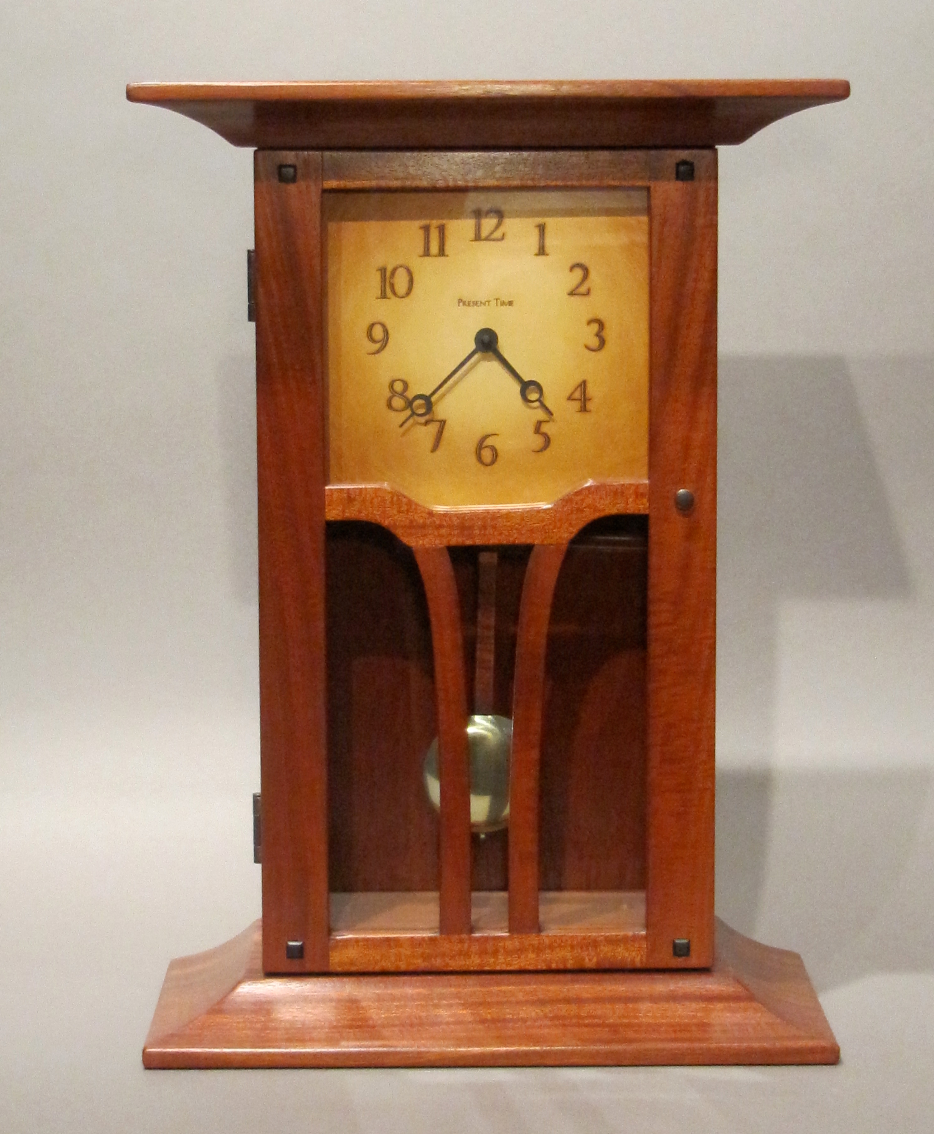 Rather than traditional Quarter-sawn Oak, I decided to do my first version in Khaya, which is a highly figured Mahogany. I first introduced this clock at the Craftsman Weekend Show in Pasadena in October of 2012. You can find out more about the yearly show in Pasadena at Pasadena Heritage. $700.